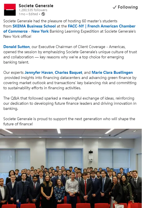 法国兴业银行官方领英账号报道SKEMA参访活动