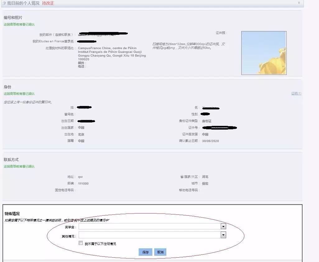 为了享受免面签政策和费用减免,学生应当在Etudes en France预签证申请系统上,《1.我目前的个人情况》内的《特殊情况》栏目中,选择相应的EEF项目编号: