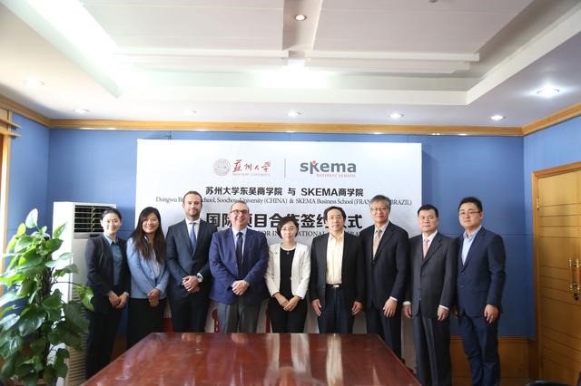 2017年11月2日上午11时许,苏州大学东吴商学院与SKEMA商学院联合培养国际硕士项目签约仪式在东吴商学院隆重举行。苏州大学东吴商学院院长冯博教授、SKEMA商学院中国校区校长杜睿天先生(Mr. Matthieu DUMONT),共同签署合作协议。苏州大学东吴商学院党委书记王永山教授、SKEMA商学院全球发展与招生录取副校长安百诺先生(Mr. Benoit ANGER)、东吴商学院副院长袁建新教授、院长助理俞雪华副教授、院长助理王要玉副教授共同见证签约仪式。签约仪式由东吴商学院外事秘书汪炜老师主持。