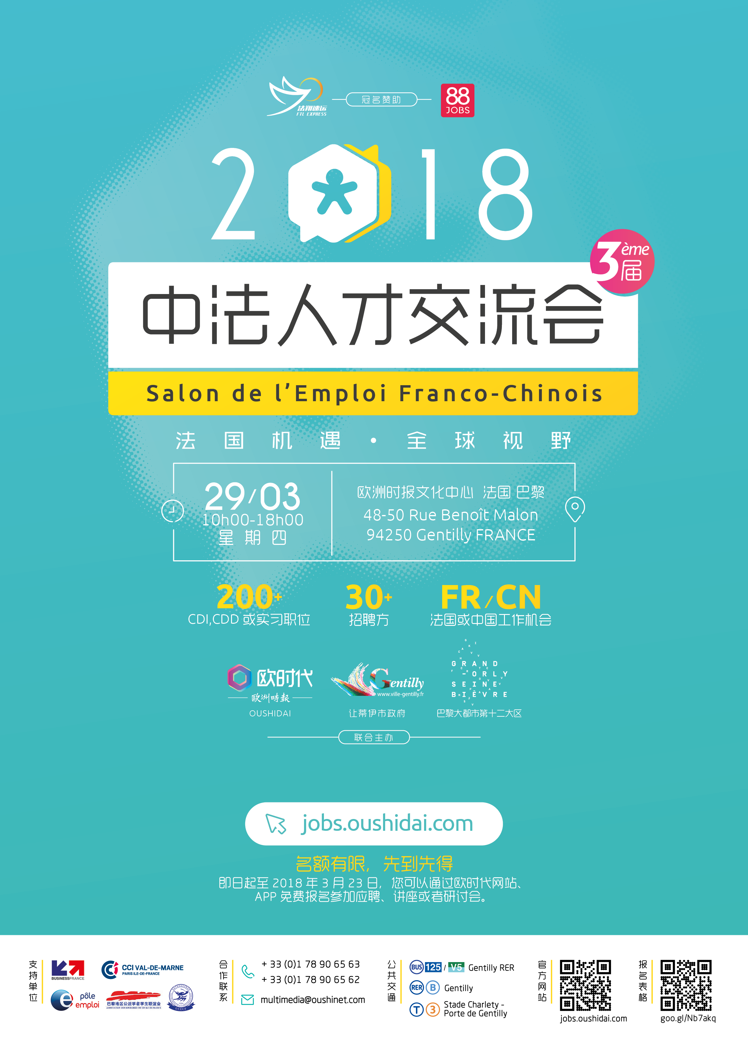 “2018第三届中法人才交流会”由欧洲时报文化传媒集团旗下的新媒体资讯服务平台—欧时代与法国94省让蒂伊(Gentilly)市政府,以及巴黎大都市第十二大区(Établissement public territorial 12 Grand-Orly Seine Bièvre Seine-Amont Territoire de la Métropole du Grand Paris)联合主办,由88JOBS法中招聘网与法翔速运FTL EXPRESS联合冠名支持。SKEMA商学院也很荣幸地成为此次活动的合作方之一,欢迎广大学生、校友们积极参与此次招聘会。