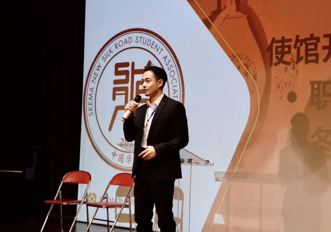 SKEMA新丝路学联主席何耀阳同学在致辞中感谢使馆教育处老师们一直以来在中外教育合作和人才交流方面的贡献以及各位受邀嘉宾对本次活动的支持,并表示将依托新丝路学联,团结和凝聚留法同学,继续为促进中法经济、文化和人才交流而努力。